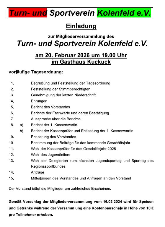 20.02.2026 - 19 Uhr: Mitgliederversammlung im Gasthaus Kuckuck